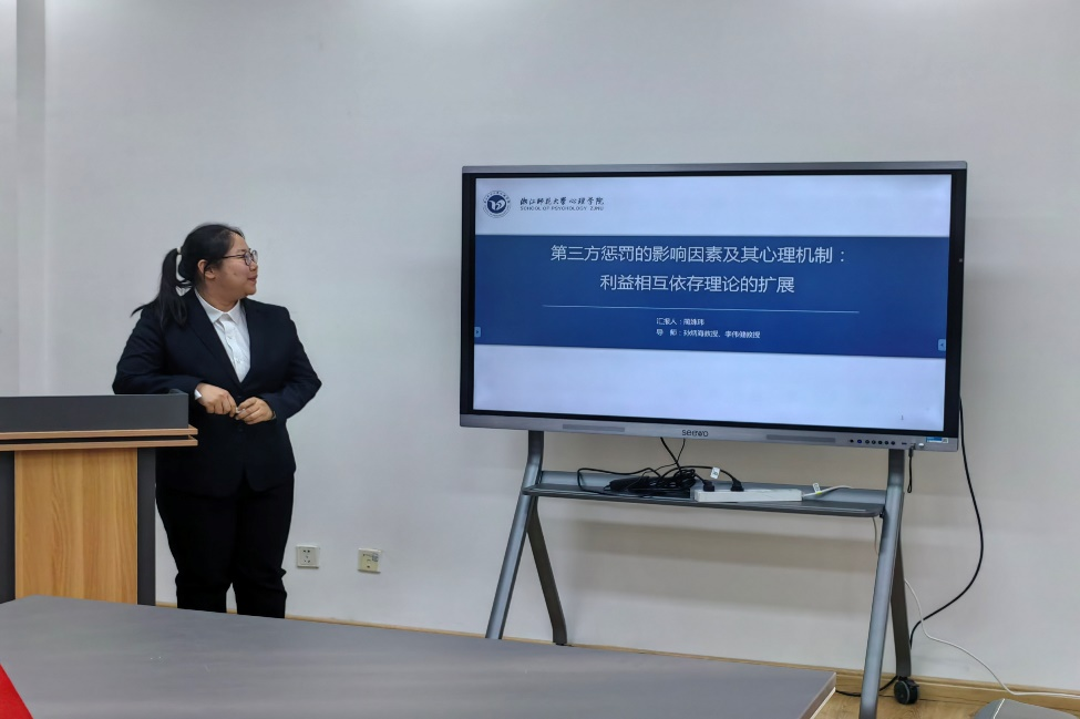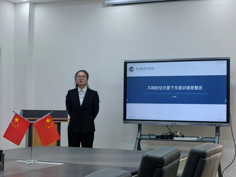 交流会上,来自浙江大学的杨西玛博士、浙江师范大学的蔺姝玮博士、万思敏博士分别作了《科研成果分享与交流》《第三方惩罚的影响因素及其心理机制:利益相互依存理论的扩展》《不同时空尺度下无意识信息整合》的学术报告。在互动环节中,三位青年博士与bat365博士生展开了热烈讨论,并就在场博士生的提问进行了详细解答,现场气氛融洽和谐。会议最后,金童林副院长对三位青年博士的精彩报告作了简单总结,讲座在热烈的掌声中圆满结束。
