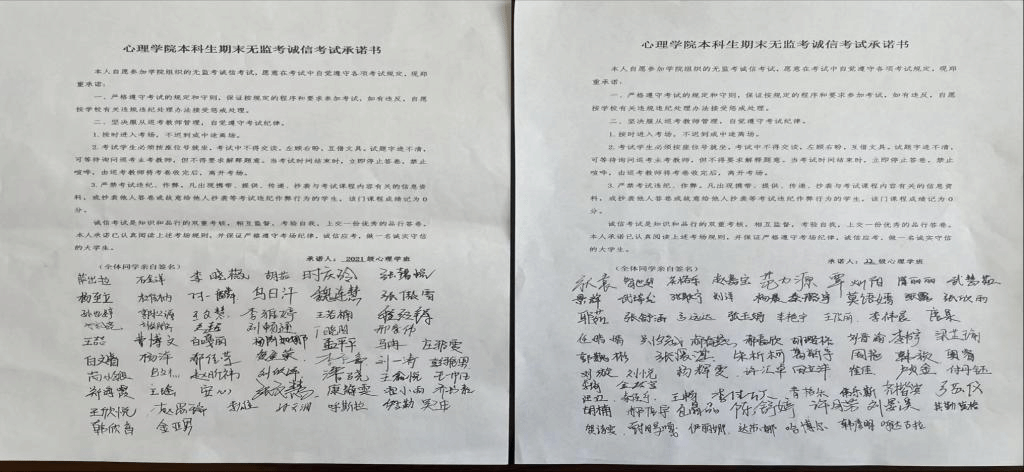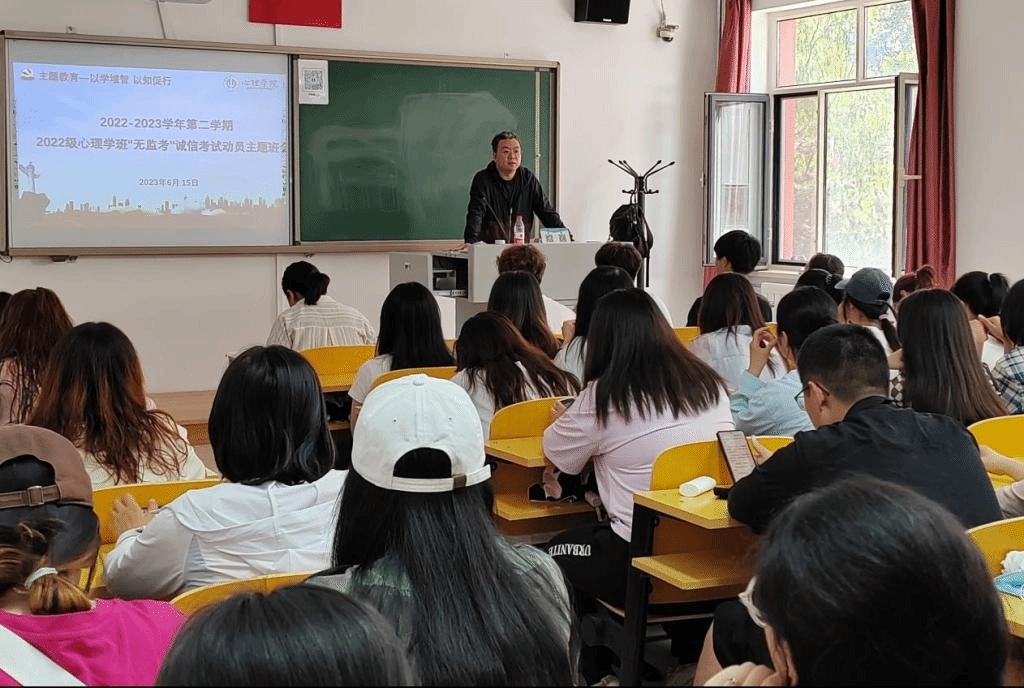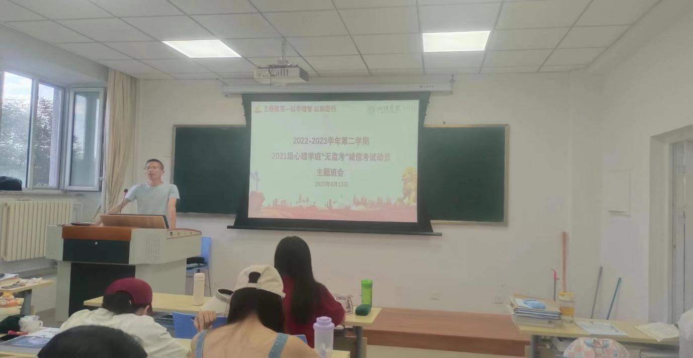 在主题教育推进之际,为进一步加强学院学风建设,做好学生诚信考试教育,确保本学期期末考试顺利进行,近日,bat365中文官方网站2021级、2022级心理学班分别召开2022-2023学年第二学期“无监考”诚信考试教育主题班会。主题班会分别由班主任董洪杰、梁宏宇主持。
