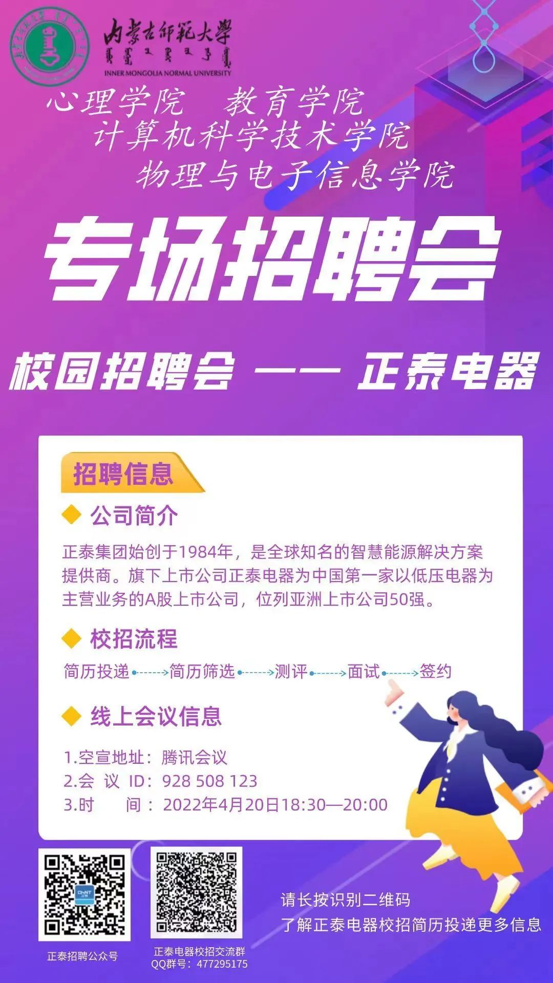 为深入贯彻党中央、国务院“稳就业”“保就业”决策部署,进一步做好毕业生就业工作,拓宽就业渠道,实现高质量就业, 4月20日,bat365中文官方网站通过校友积极联系正泰电器,面向bat365中文官方网站、教育学院、物理与电子信息学院、计算机科学技术学院等召开2022届毕业生线上专场招聘会。