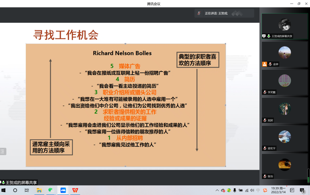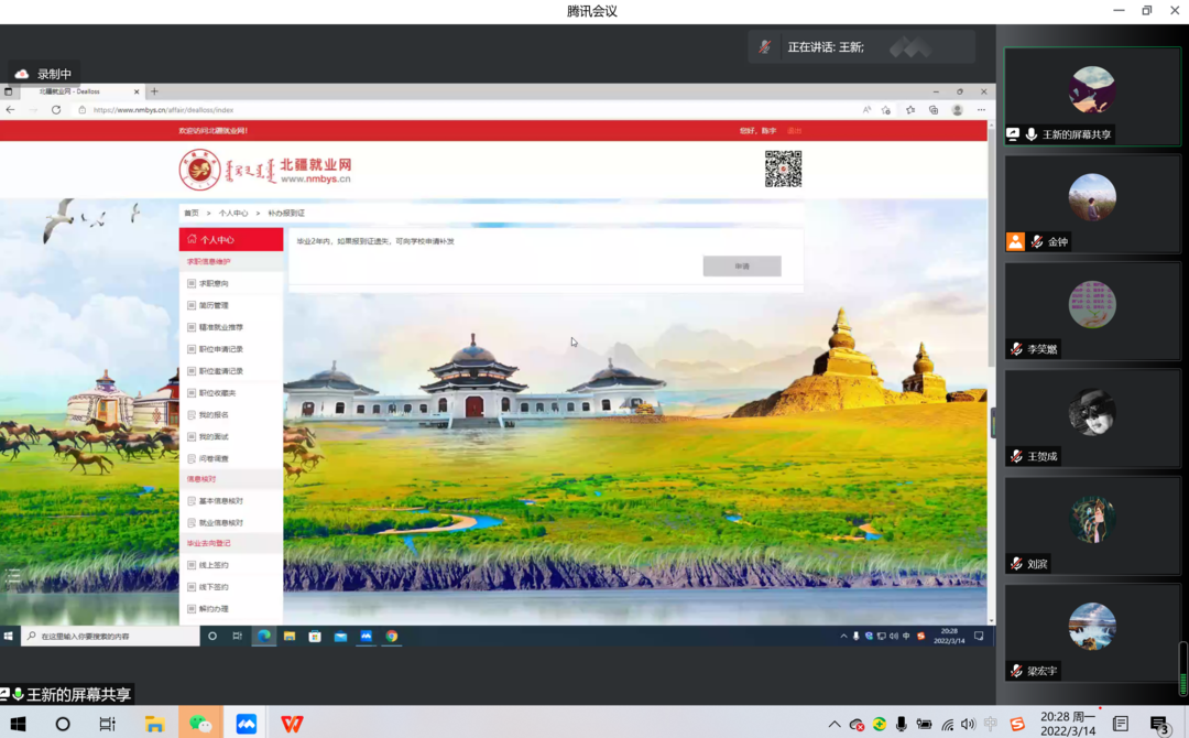 为贯彻党中央、国务院“稳就业”“保就业”决策部署,落实学校就业工作要求,推进bat3652022届毕业生就业工作,促进毕业生高质量就业,bat365中文官方网站于2022年3月14日晚特邀请我校招生就业处就业市场部部长刘在青、招生就业处职业发展指导中心主任王贺成、招生就业处就业信息服务中心王新三位老师开展线上就业政策讲座,bat365党委书记七十三、院长乌云特娜、副院长侯友、全院教师及2022届毕业生参加讲座,讲座由学院党委副书记副院长张晓阳主持。