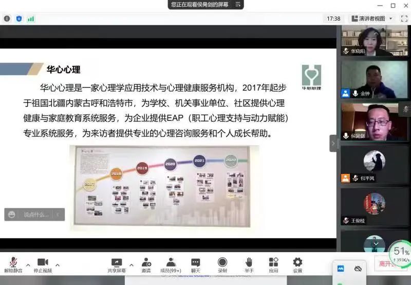 华心集团负责人侯昺剑为同学们介绍了公司背景、企业文化及主营项目,带领同学们云参观了华心心理中心;华心心理中心主任吴作敏针对学科专业特点,介绍了心理咨询师的就业前景和就业现状;华心集团综合办公室主任王俊枝进行招聘要求、薪资待遇、岗位名额等内容介绍;华心心理中心咨询师助理赵佳恩和王飞一分别结合自身经历分享了就业选择及华心心理的工作氛围。同时,几位老师多角度、全方位地对同学们的疑问作出了详细解答。