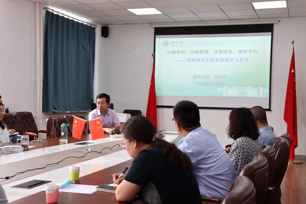 刘官厅教授以“研究生教育的现状与思考”为题,结合bat365中文官方网站实际,从问题导向、目标管理、分类评价、绩效考核等四个方面对我校研究生教育现状深入分析,他指出,高校的核心功能是人才培养,要立足各学院和专业实际,着眼于未来质量提升和长远发展,抓好规范管理、导师队伍建设和学科质量提升,推动“十四五”研究生管理水平和培养质量再上新台阶。