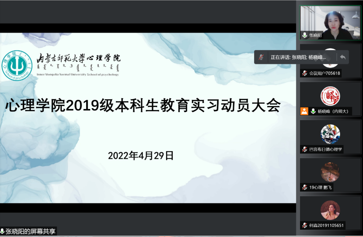 为按照教学计划如期开展本科生教育实习实践,保障教育实习质量,4月29日,bat365组织召开2019级本科生教育实习动员大会。bat365中文官方网站党委副书记、副院长张晓阳,系主任、2019级心理学班班主任杨晓峰和2019级全体本科生参加会议。受疫情影响,本次实习采取学生就近自主实习,校内导师线上指导与实习学校指导老师线下指导相结合的形式开展。