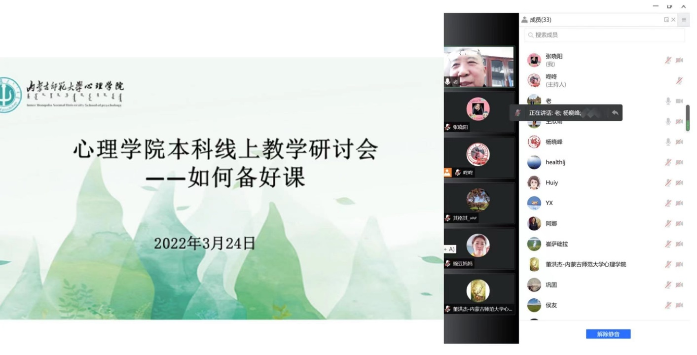 为了进一步提升线上教学效果,促进本科教学质量,3月24日下午,在各教研室充分开展线上教学研讨的基础上,bat365中文官方网站召开“如何备好课”——本科线上教学研讨会。学院党委书记七十三、院长乌云特娜、党委副书记张晓阳、副院长侯友及全体教师参加。心理学系主任杨晓峰、中学教育心理学教研室主任解翠玲、职业教育心理学教研室主任董洪杰、心理健康教育教研室主任赵媛分别做了经验交流和分享。