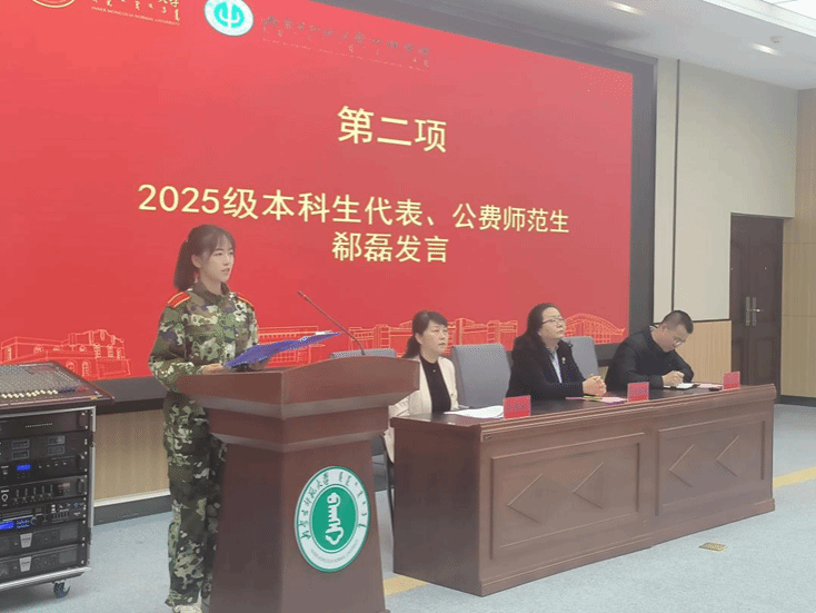 2025级心理学班郗磊作为本科生新生代表发言。她表达了对bat365中文官方网站的向往与期待,从个人与心理学结缘的经历出发,展现出新一代学子对学科的热爱以及对大学生活的憧憬。