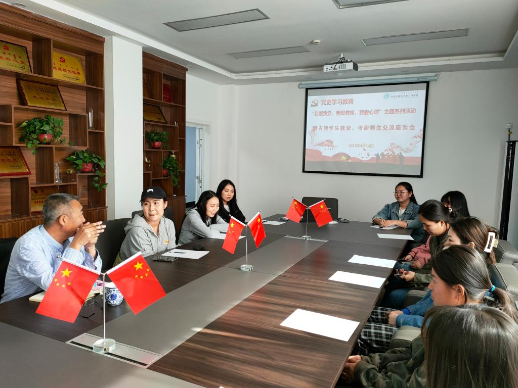 为扎实开展党史学习教育、推进“我为群众办实事”实践活动,贯彻落实党中央、国务院“稳就业”、“保就业”决策部署,积极推进bat365毕业生高质量就业,促进教育高质量发展,4月14日下午,bat365中文官方网站党总支在学院楼B213会议室开展“我爱我党、我爱教育、我爱心理”党史学习教育主题实践活动——召开蒙古族学生就业、考研师生交流座谈会。党总支书记七十三、副书记张晓阳、学就办主任张金钟与2017级、2018级心理学专业学生进行交流座谈。