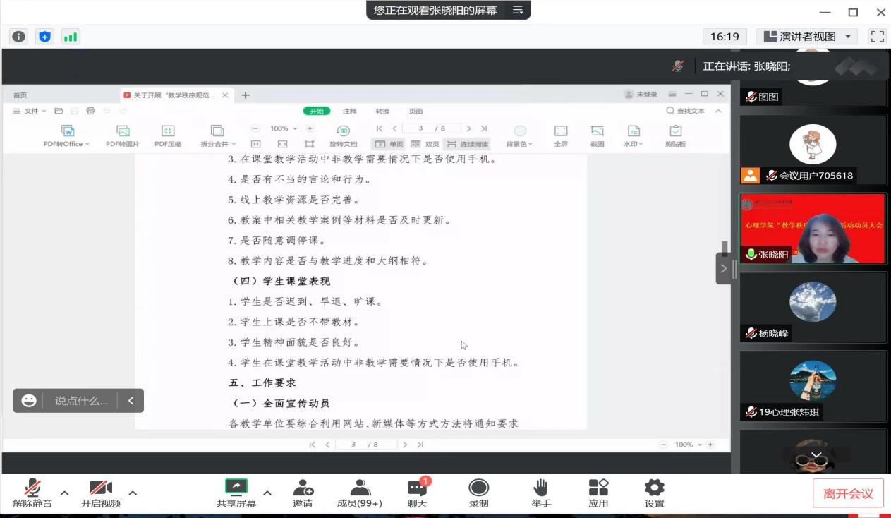 为进一步规范课堂秩序,培育优良教风学风, 9月5日,bat365召开 “教学秩序规范月”活动动员大会。院党委副书记、副院长张晓阳主持会议。心理学系主任杨晓峰,教务办负责人王朝力门以及2019级、2020级、2021级全体本科生参加会议。